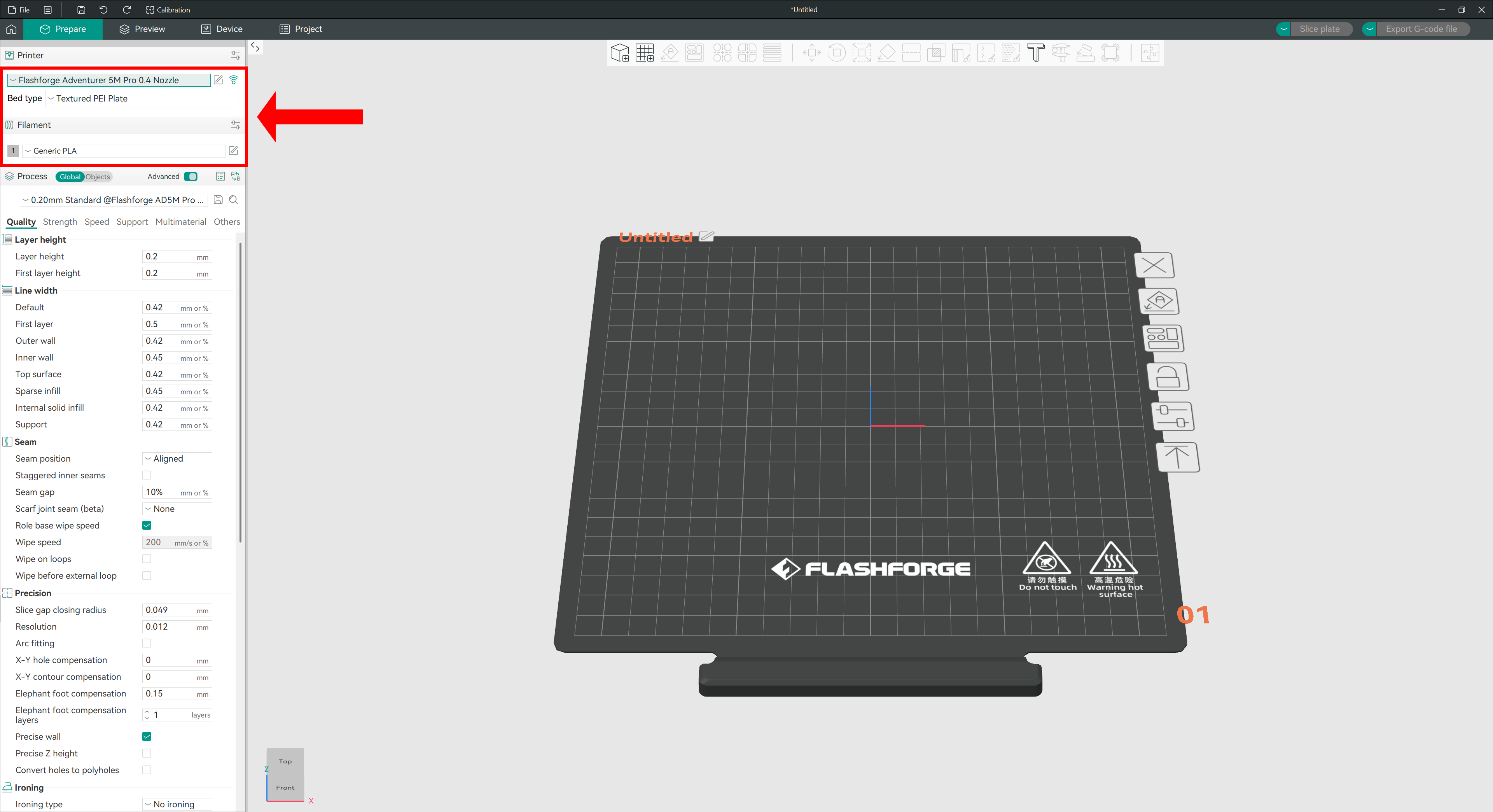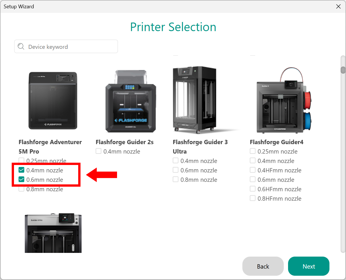 Scroll through Printer Selection and find the Flashforge Adventurer 5M Pro category, select both the 0.4mm and 0.6mm nozzle