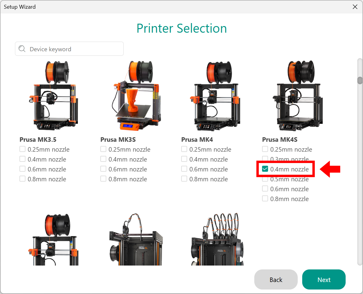 Continue scrolling and find the Prusa MK4S category and select 0.4mm nozzle, then click Next
