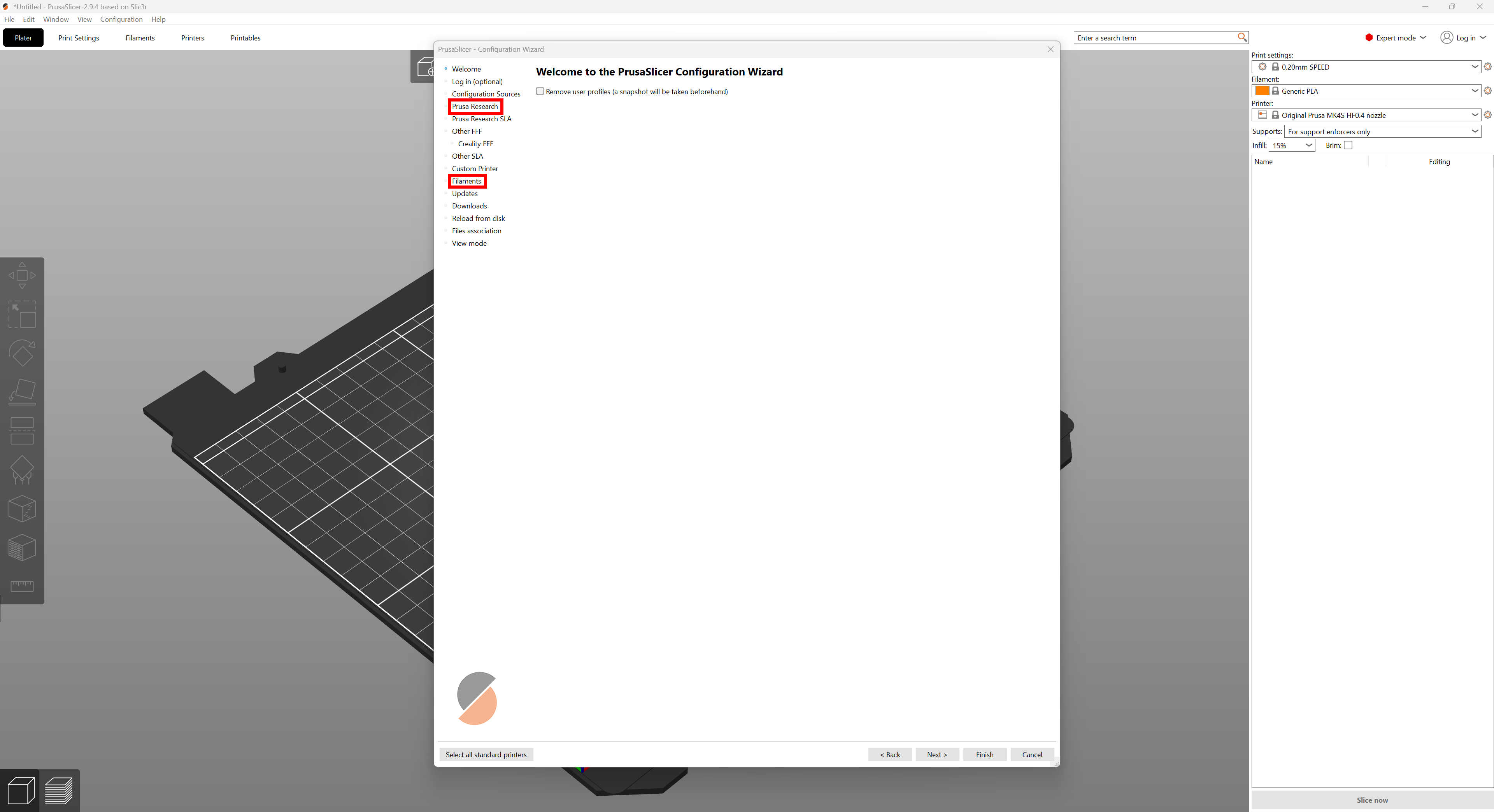 Open PrusaSlicer after the installation finishes, for the initial startup it may download extra configuration files, let it finish and the Configuration Wizard should appear like below