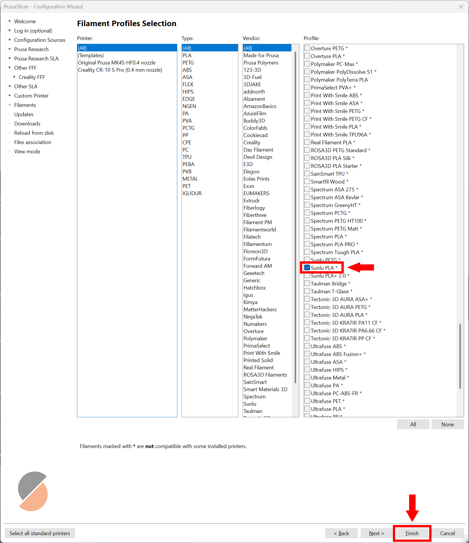 For Filaments, scroll down the rightmost window and select Sunlu PLA. Generic PLA should be pre-selected by default, if not, check that box as well