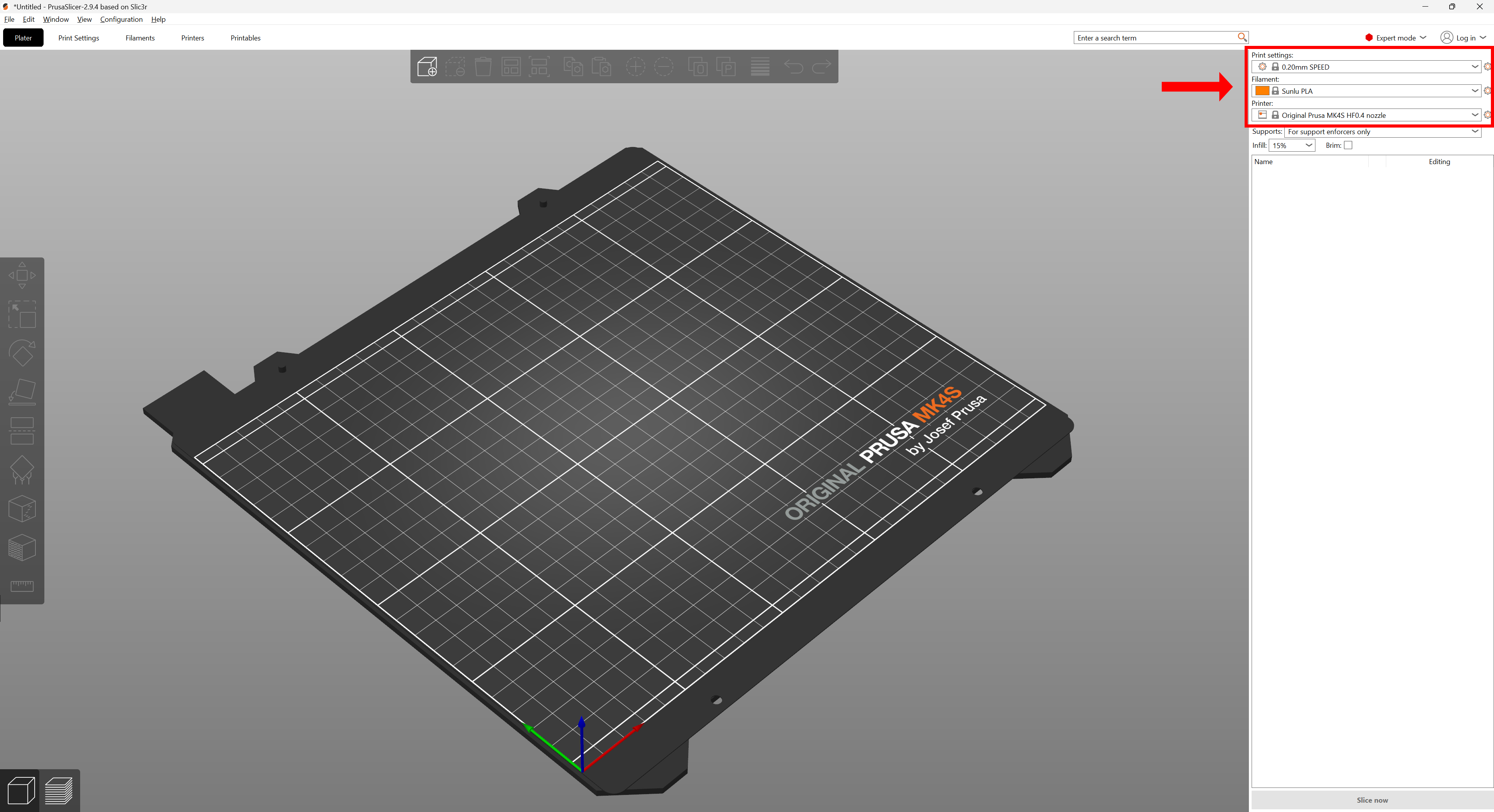 The main PrusaSlicer workspace will look similar to the image below, with the dropdown menus to change printers and filament outlined